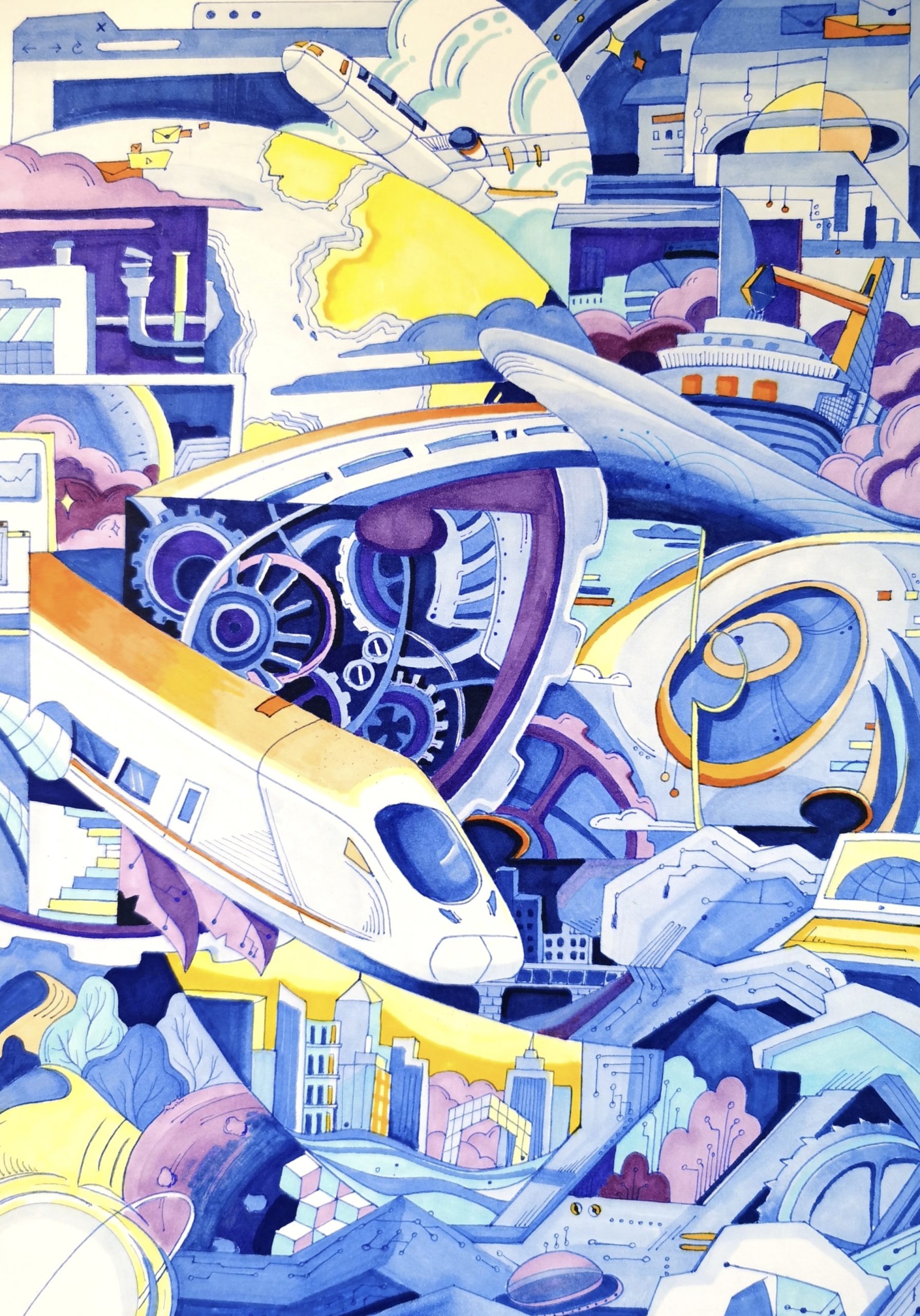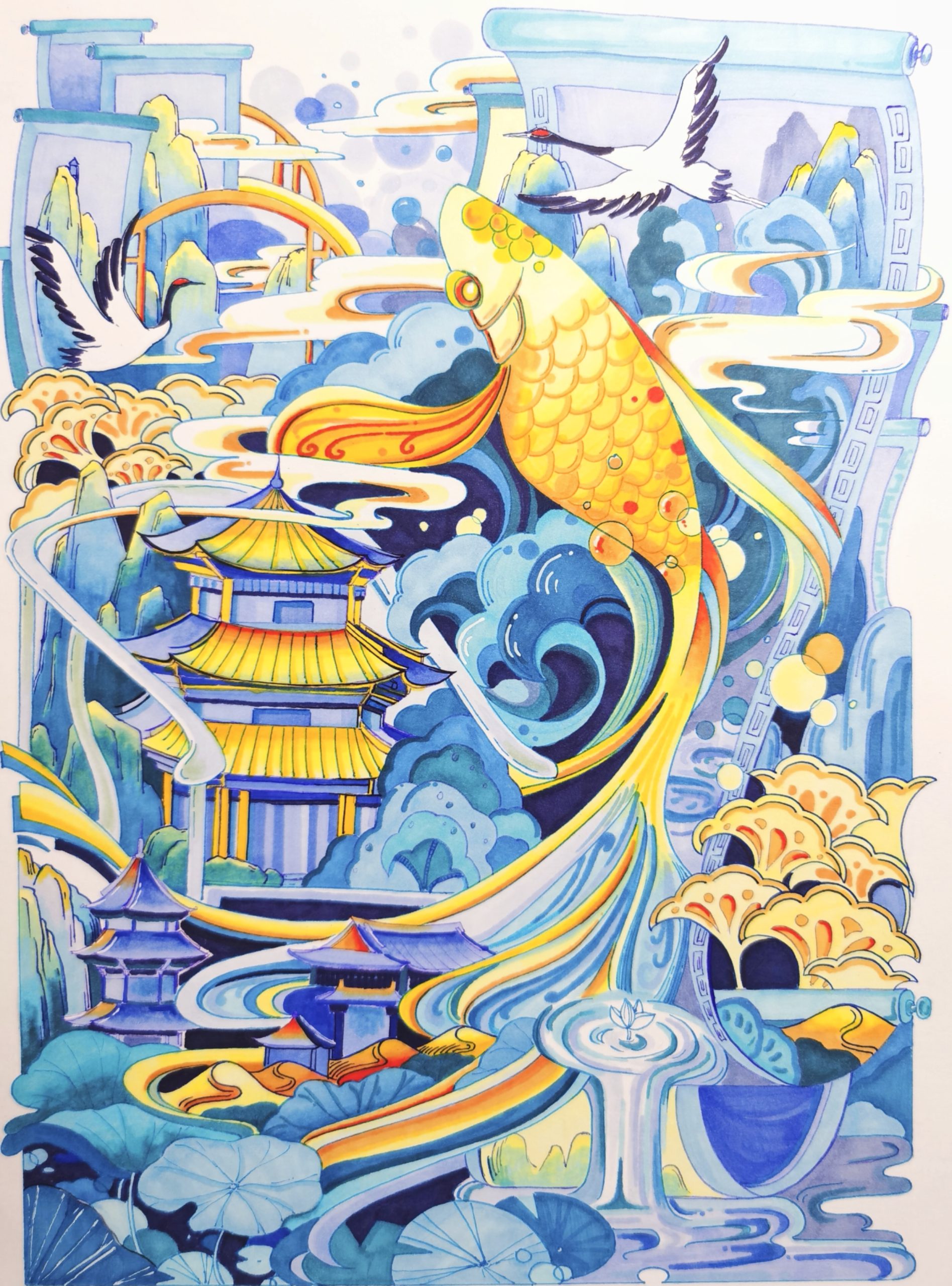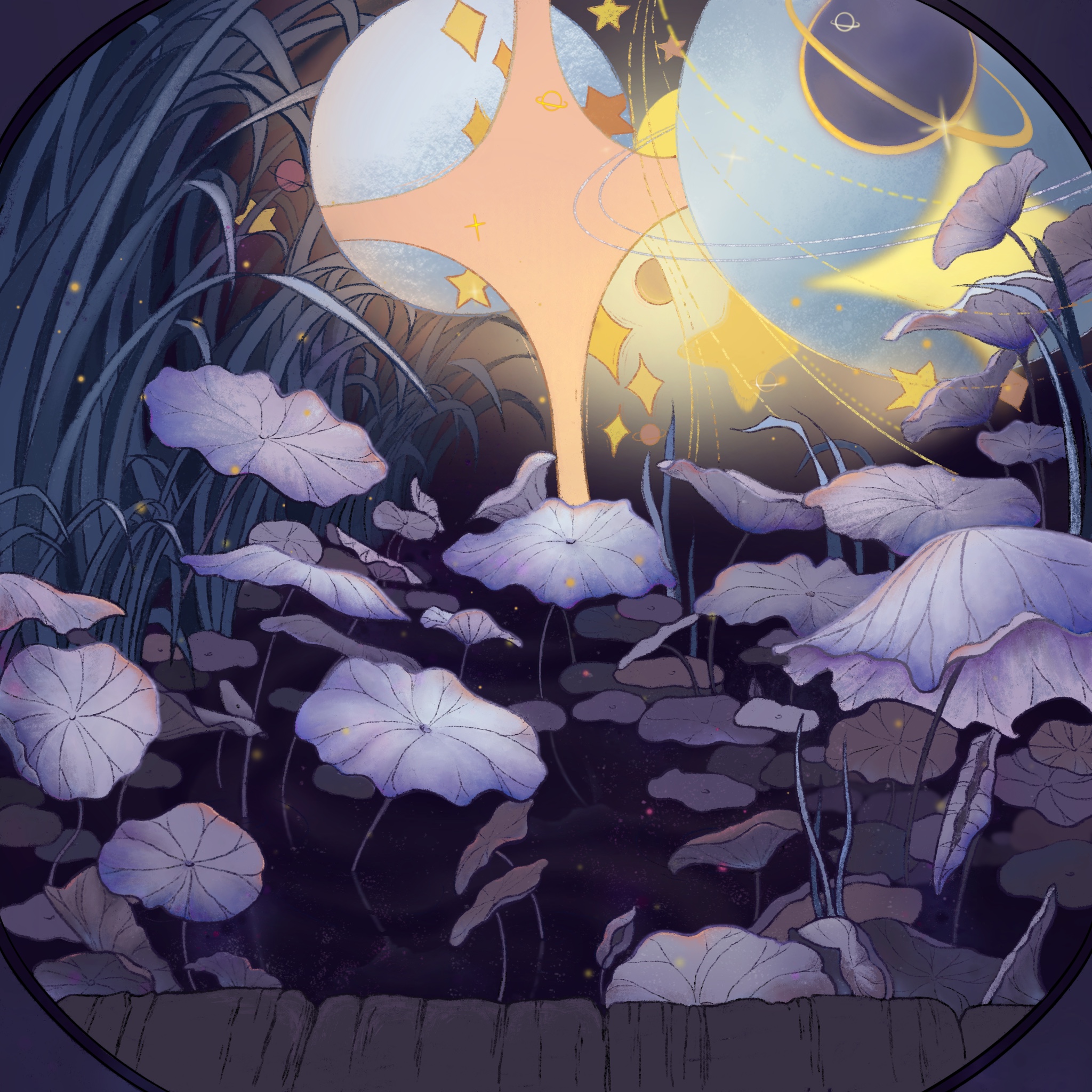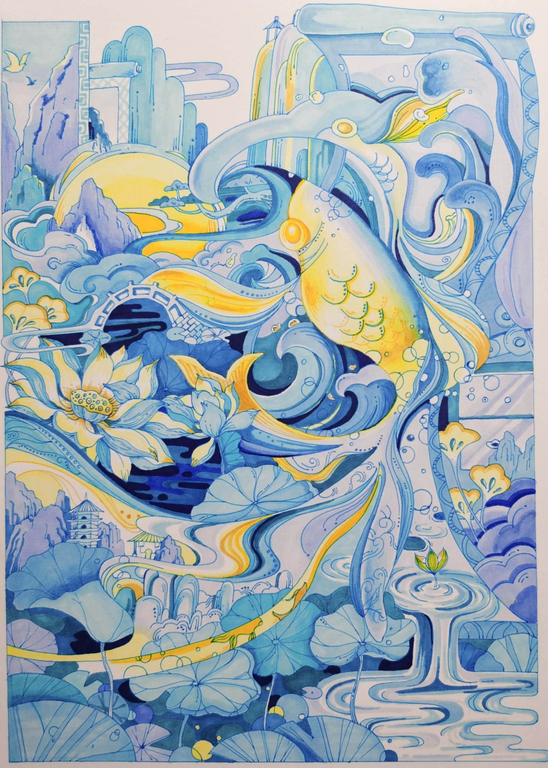The scenery in the painting is from my hometown in China. There is a lotus pond in the park near the community, where I like to be in a daze, feeling the breeze and the leaves swaying; everything is calm and comfortable.