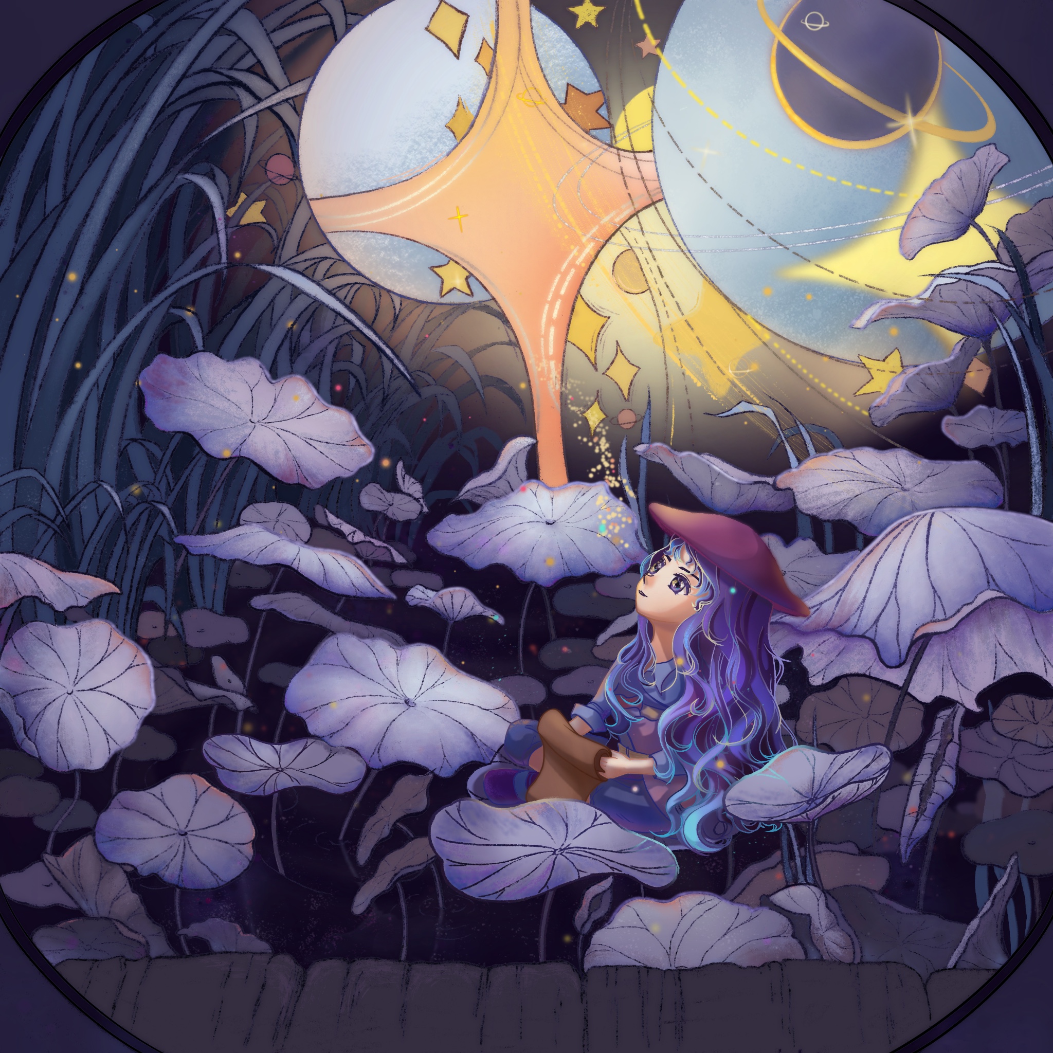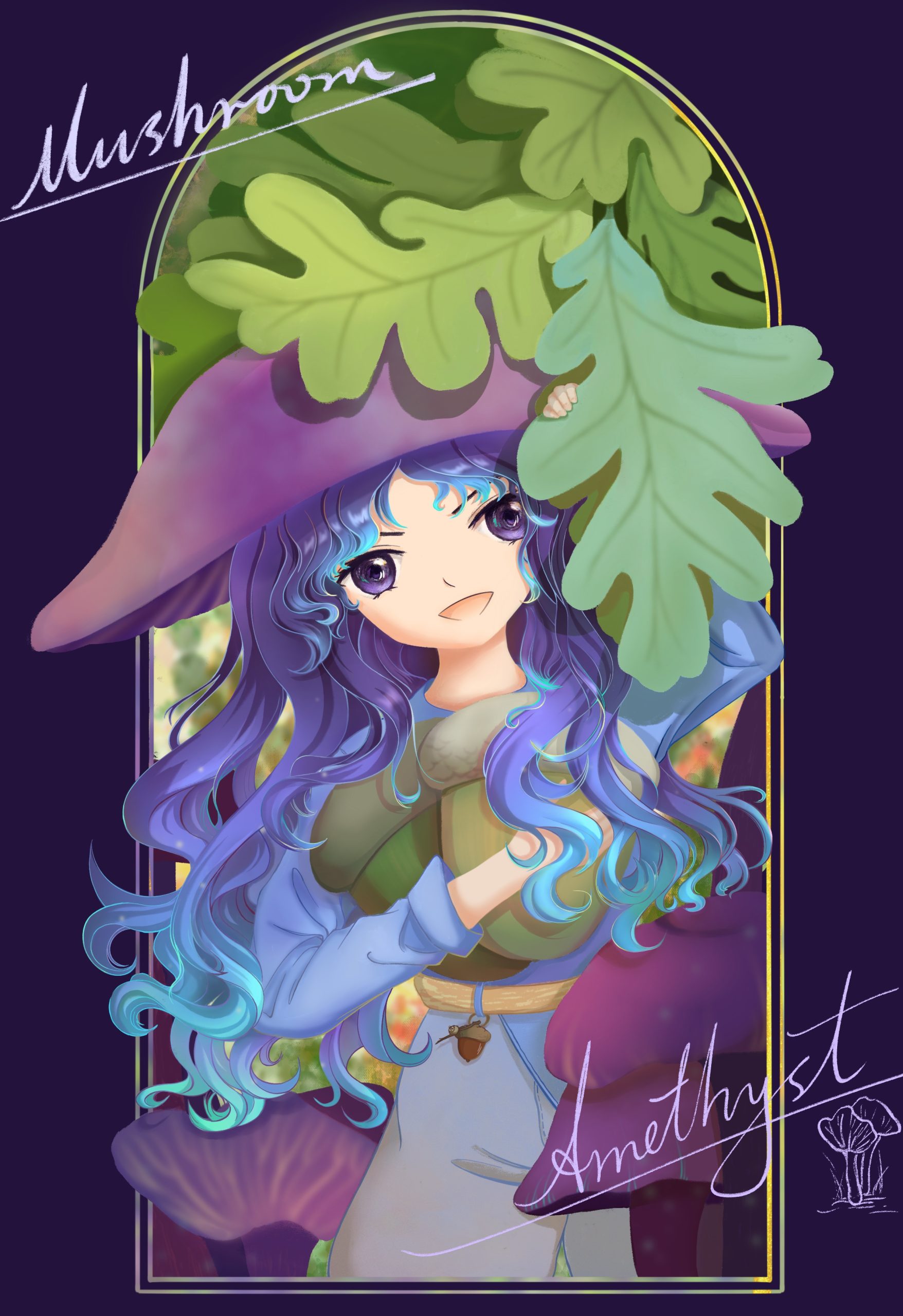 Regarding the characters in the picture, these are my original characters. She was inspired by a mushroom, Amethyst Deceiver, which is a brightly colored edible mushroom. Out of my love for mushrooms and exploring the world, I created Amethyst, who has colorful hair and loves adventure. In my story, she is about to embark on a fantastic journey.