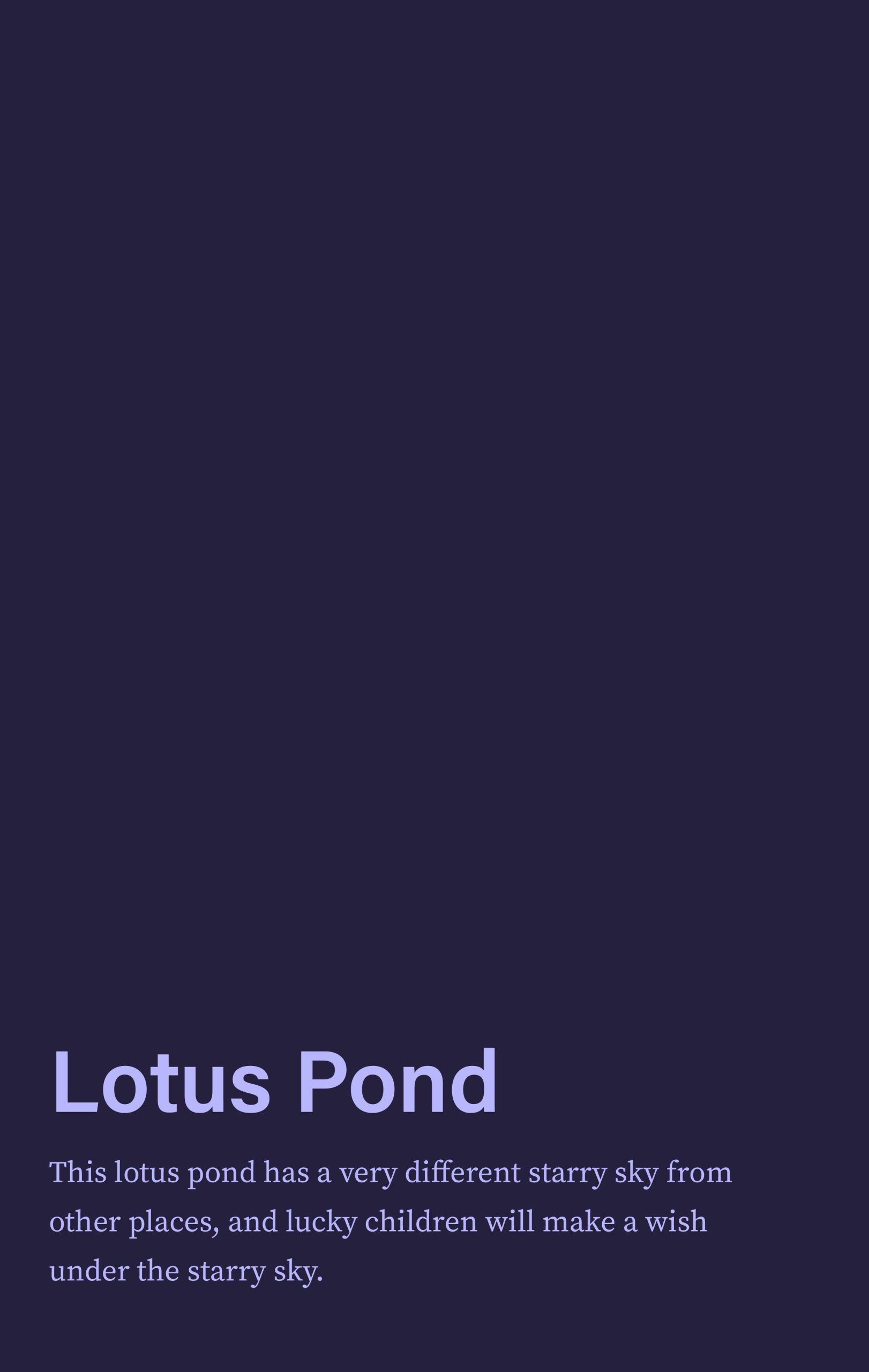 The Lotus Pond is Amethyst’s first stop as she begins her journey, which is also my first journey out of the house. In my story, she will make friends with different people as she travels through various landscapes, inspiring me for future journeys.